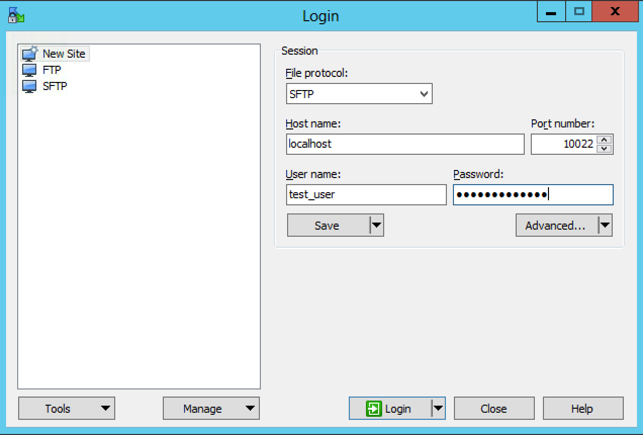 Add the file protocol, host name, port number and username details. The values used are part of our default configuration for the SFTP service: