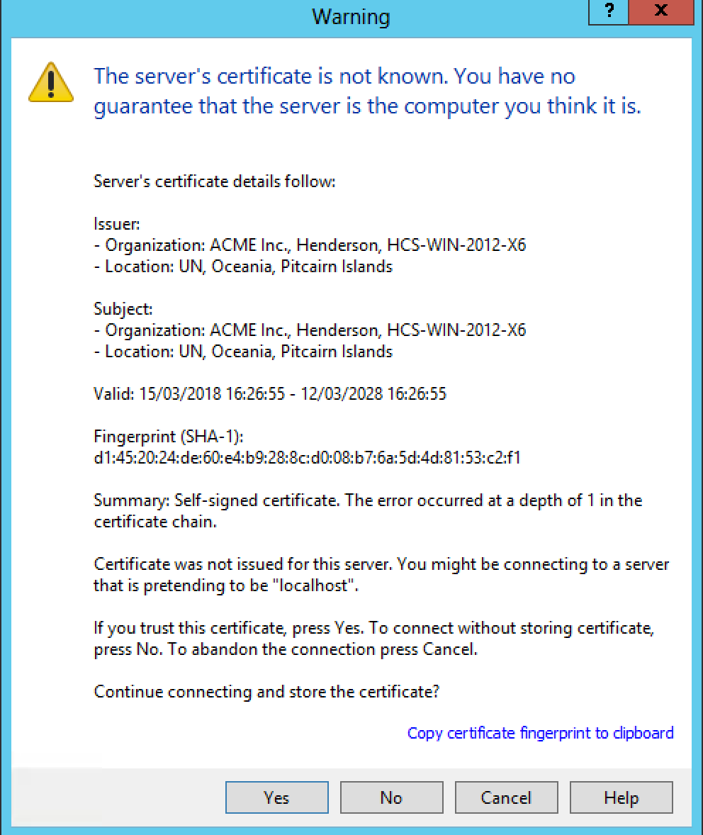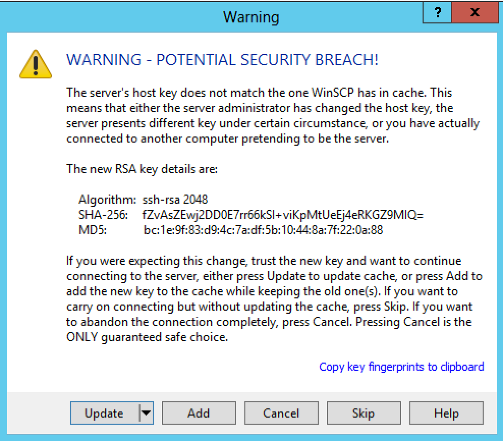 And after connection, you will be presented with the SFTP server fingerprint. Since this testing is conducted on a new server key, a warning is presented. Please check the server key prior to accepting. To use your own SSH keys, please configure the SFTP service accordingly.