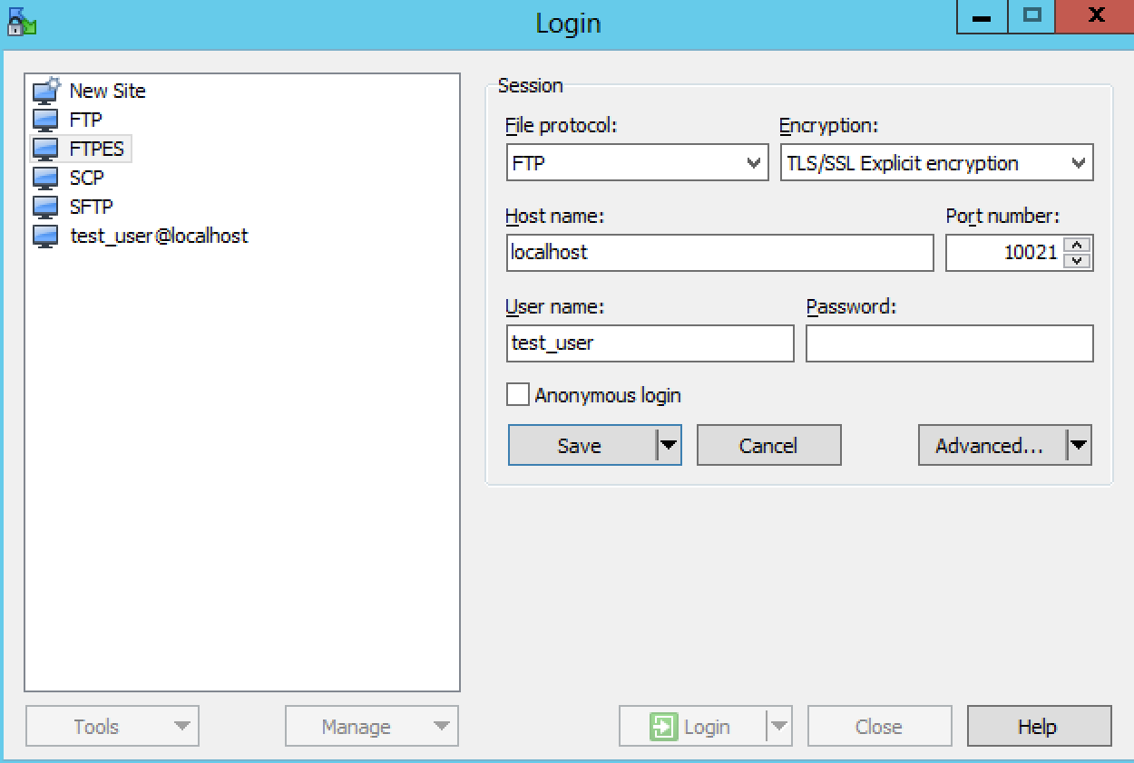 Add the file protocol, host name, port number and username details. The values used are part of our default configuration for the FTPES service: