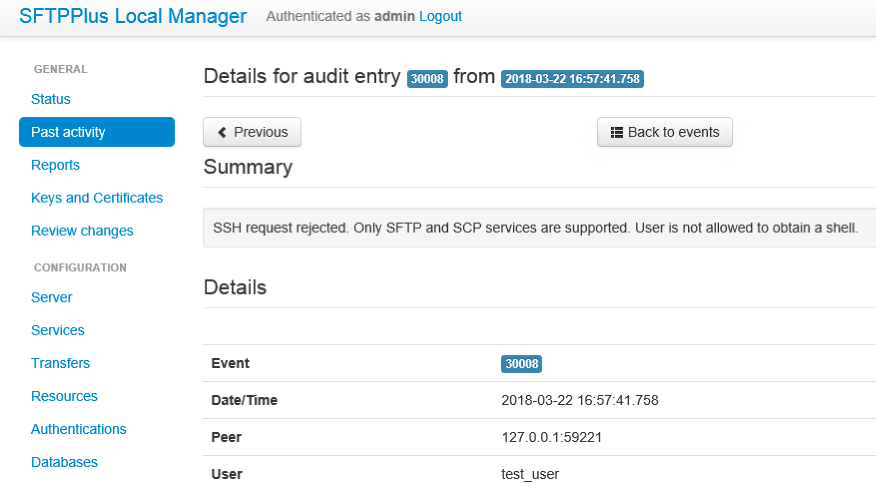 2018-03-22 17:56:42.968 Access granted2018-03-22 17:56:42.968 Opening session as main channel2018-03-22 17:56:42.968 Opened main channel2018-03-22 17:56:42.970 Server refused to start a shell/command2018-03-22 17:56:42.982 (EFatal) Server refused to start a shell/commands2018-03-22 17:56:42.982 Authentication log (see session log for details):2018-03-22 17:56:42.982 Using username "test_user".2018-03-22 17:56:42.982 Authentication failed.